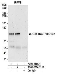 General Transcription Factor IIIC Subunit 3 antibody, A301-238A, Bethyl Labs, Immunohistochemistry frozen image  IHC-F, General Transcription Factor IIIC Subunit 3 antibody, A301-238A, Bethyl Labs, Immunoprecipitation image  IP, General Transcription Factor IIIC Subunit 3 antibody, A301-238A, Bethyl Labs, Western Blot image  WB